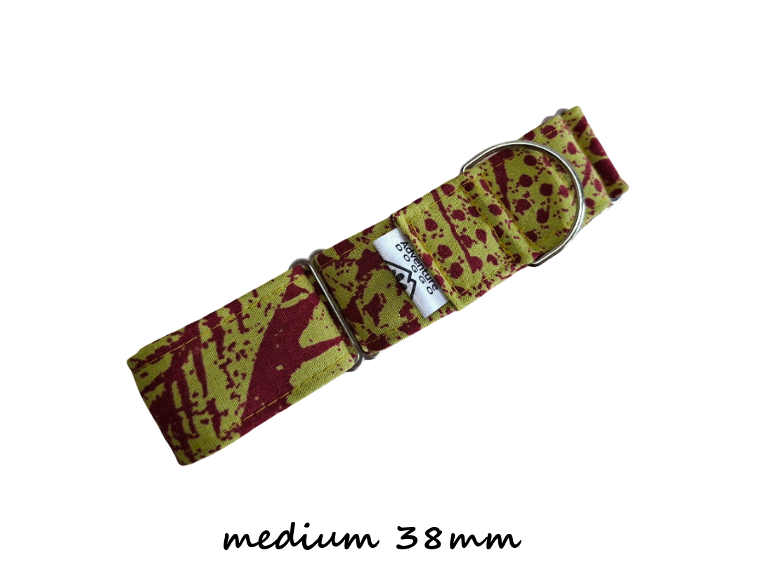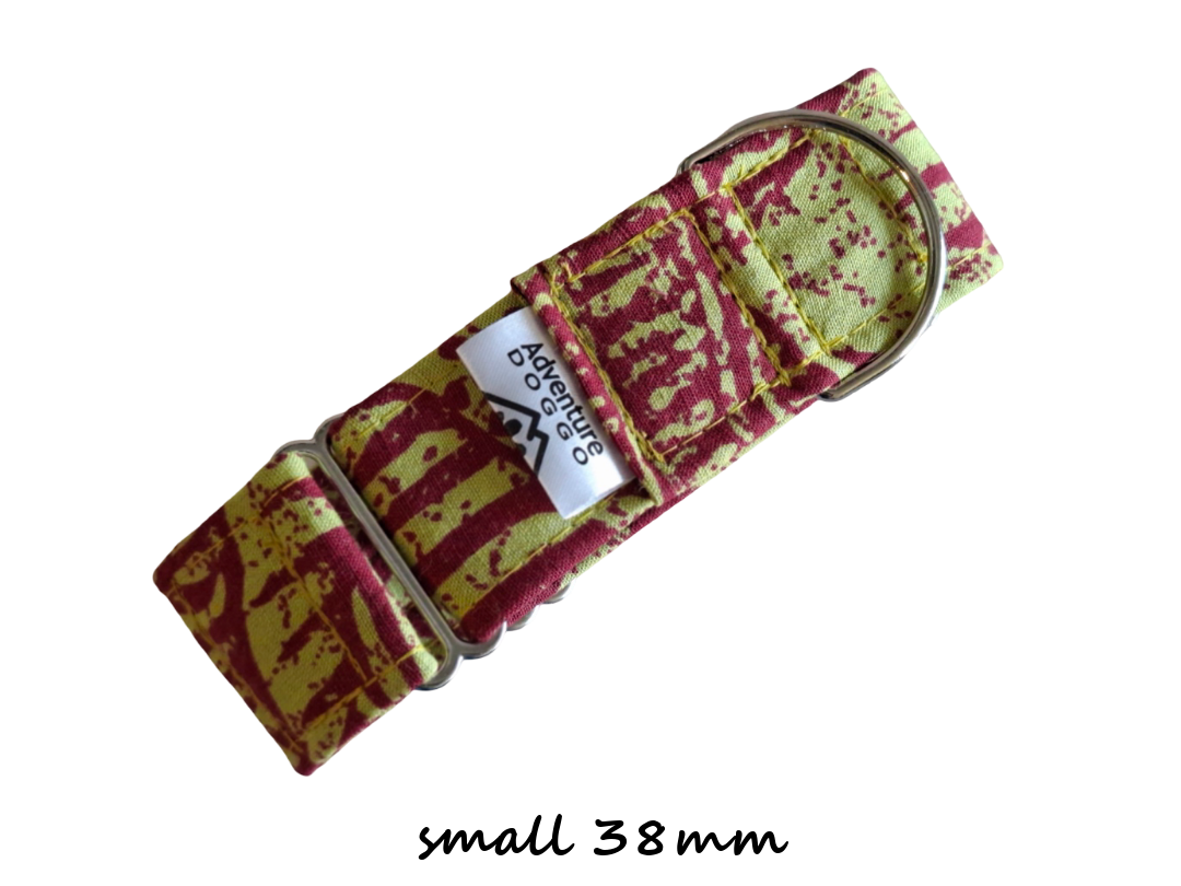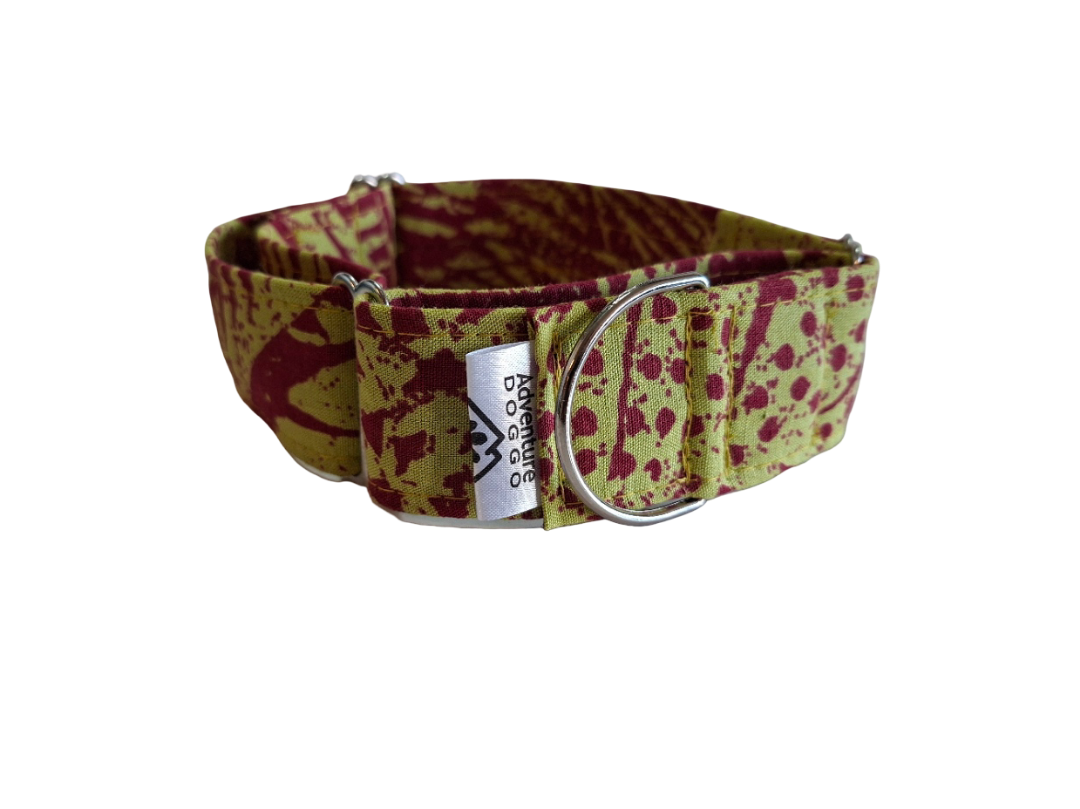 Martingale collars are particularly suited to dogs that have heads smaller than their necks, e.g. greyhounds, whippets, or borzois but are a fantastic design for any doggo. Martingale collars are not for constant wear – they are for leash walking only as the very attribute that makes them secure (tightening when pulled) presents a choking hazard should your doggo become caught up on something.